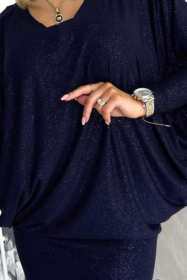 Materialul elastic și fin cu particule sclipitoare transformă orice apariție într-una memorabilă. Decolteul larg adaugă o notă de senzualitate discretă, iar linia lejeră a rochiei o face ușor de accesorizat atât în stil elegant, cât și în variante casual-chic.